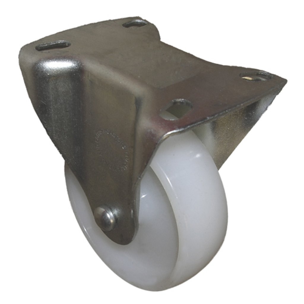 100mm Top Plate Fixed Castor (Pressed Steel) with 80×60 Hole Centres. Nylon Wheel with Plain Bore. Load Capacity = 150kg