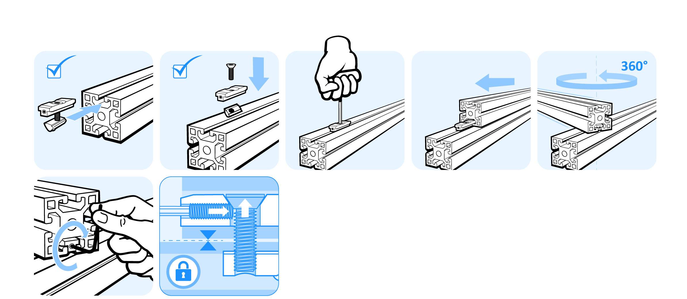 Profile connector to cross or parallelly connect two aluminum profiles with slot 10. Assembly without machining!
