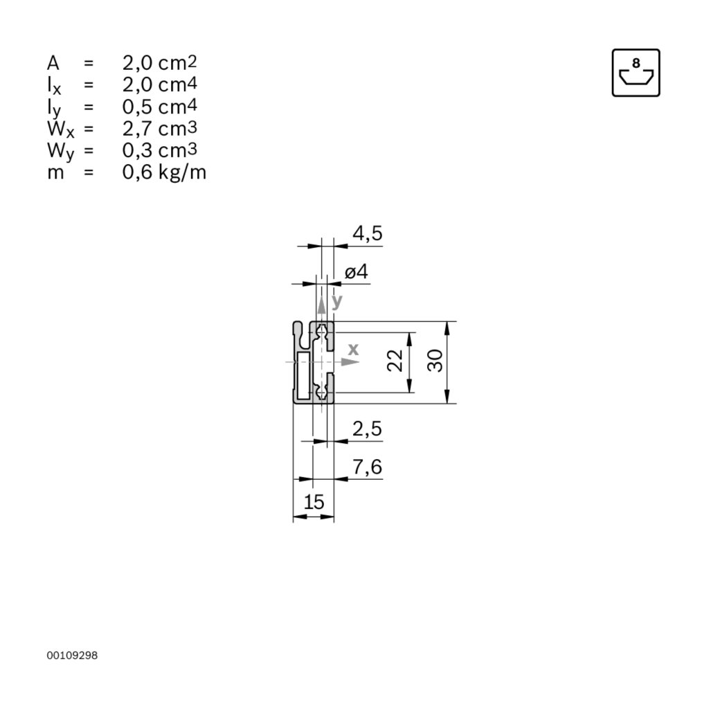 | Description | Suspension Profile | 8mm groove | 15 x 30mm | Genuine Bosch Rexroth |