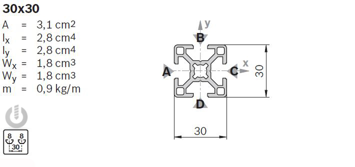 | Description | Aluminium Strut Profile | 8mm groove | 30 x 30mm | Genuine Bosch Rexroth |