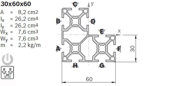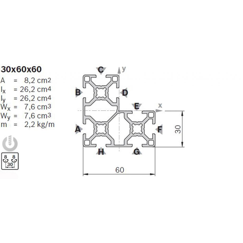 | Description | Aluminium Strut Profile | 8mm groove | 30 x 60 x 60mm | Genuine Bosch Rexroth |