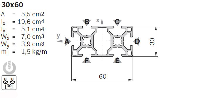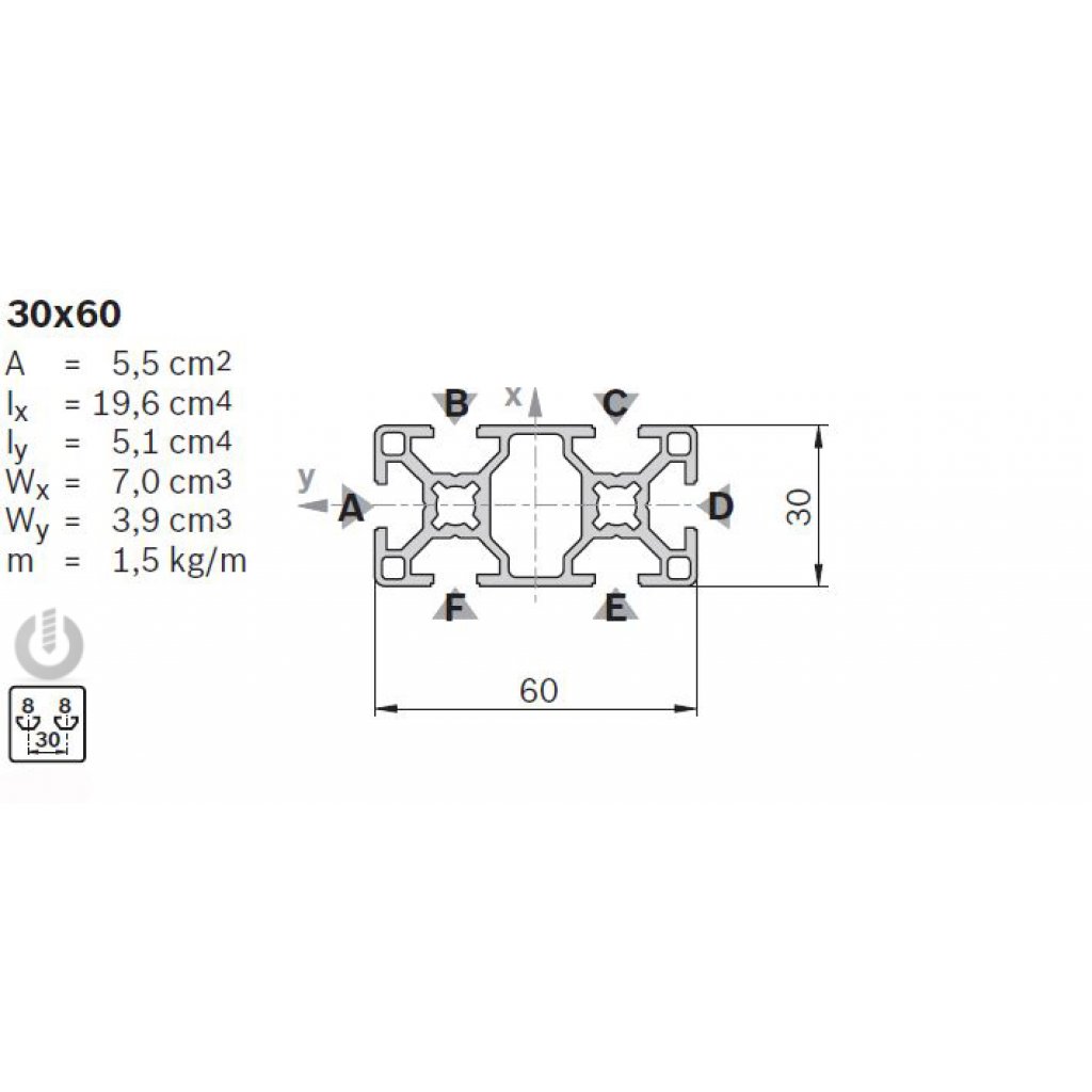 | Description | Aluminium Strut Profile | 8mm groove | 30 x 60mm | Genuine Bosch Rexroth |