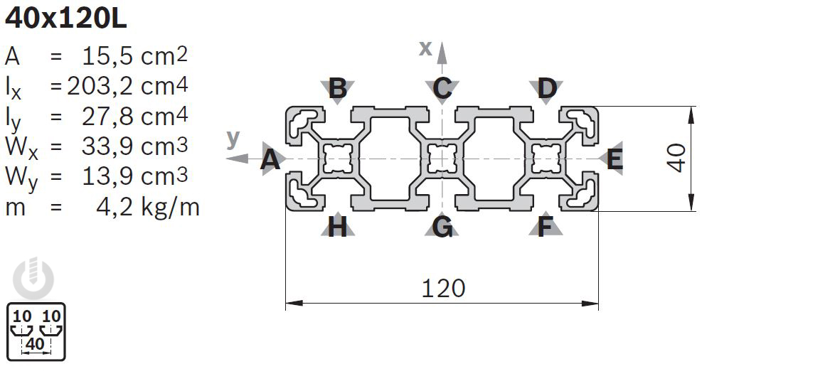 | Description | Aluminium Light Strut Profile | 10mm groove | 40 x 120mm | Genuine Bosch Rexroth |