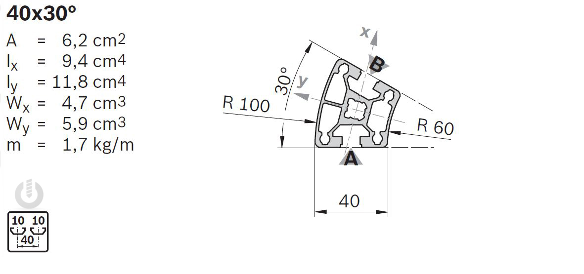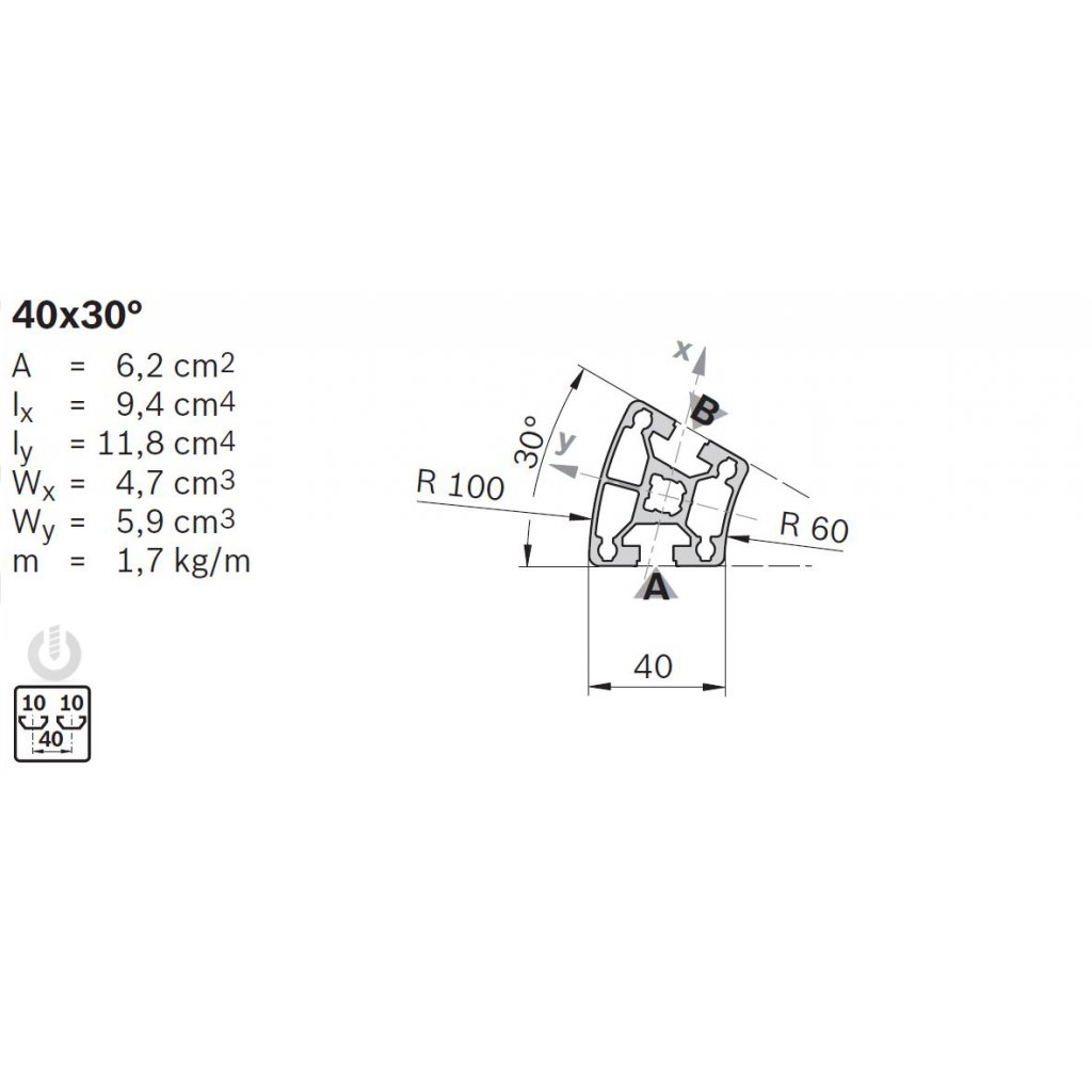 | Description | Aluminium Strut Profile | 10mm groove | 40 x 30° | Genuine Bosch Rexroth |