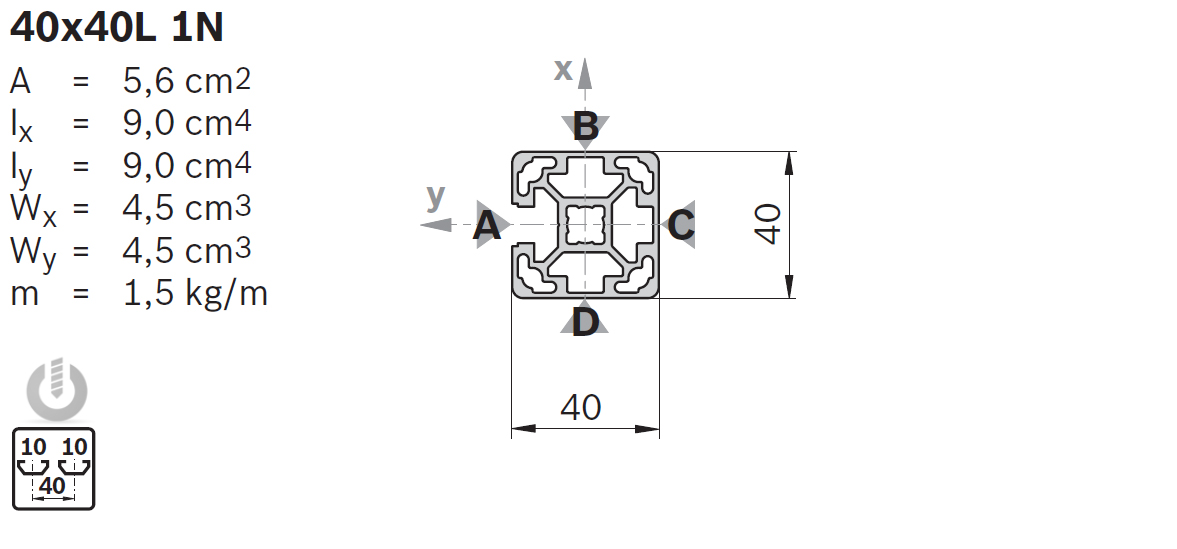 | Description | Aluminium Light Strut Profile | 10mm groove | 40 x 40mm | 1N | Genuine Bosch Rexroth |