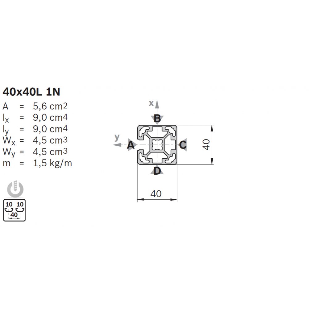 | Description | Aluminium Light Strut Profile | 10mm groove | 40 x 40mm | 1N | Genuine Bosch Rexroth |