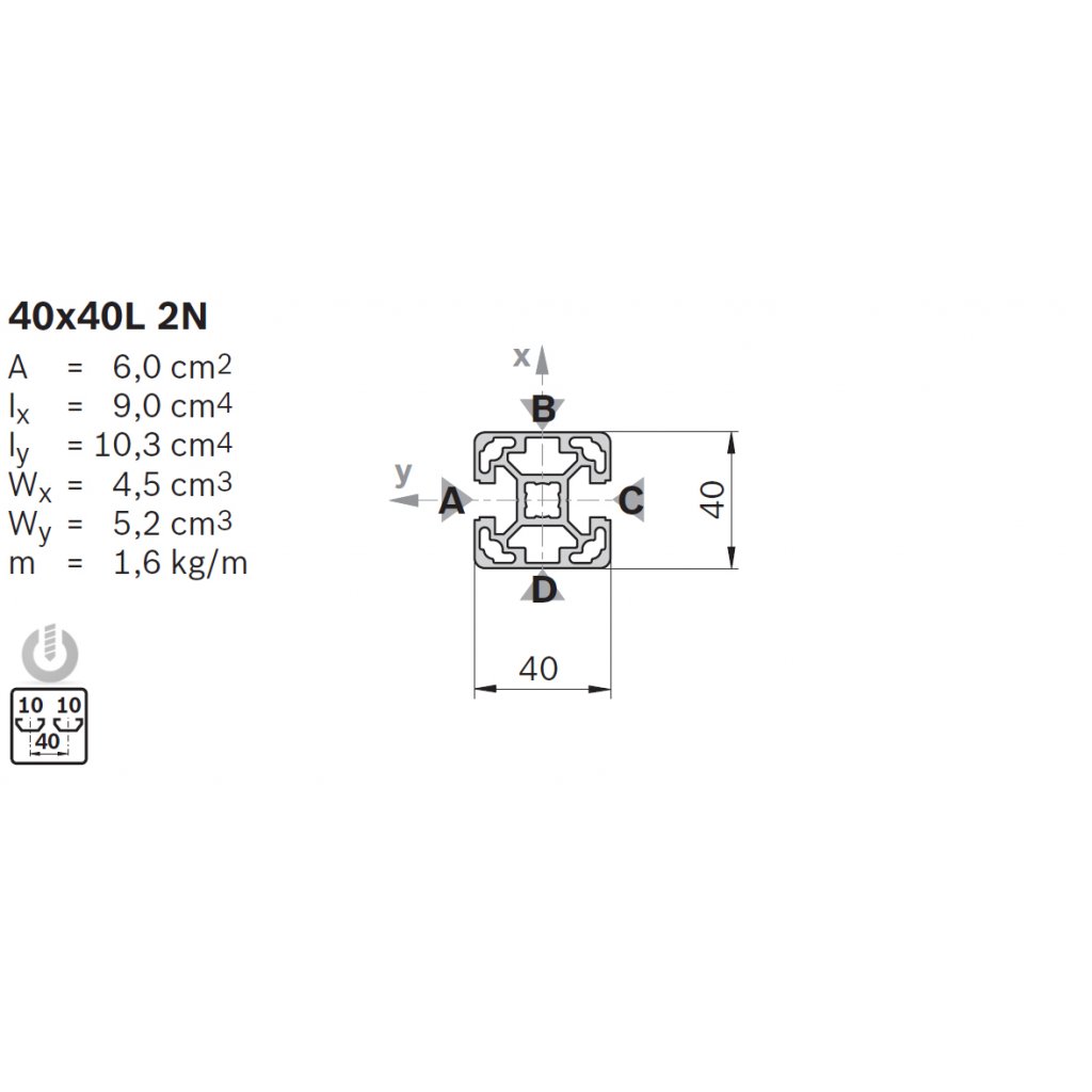 | Description | Aluminium Light Strut Profile | 10mm groove | 40 x 40mm | 2N | Genuine Bosch Rexroth |