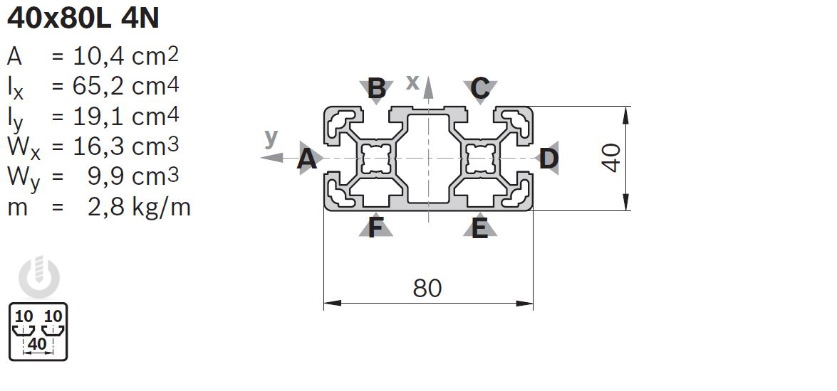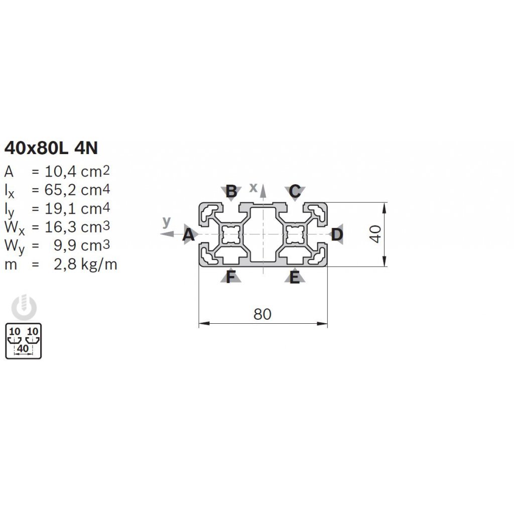 | Description | Aluminium Light Strut Profile | 10mm groove | 40 x 80mm | 4N | Genuine Bosch Rexroth |