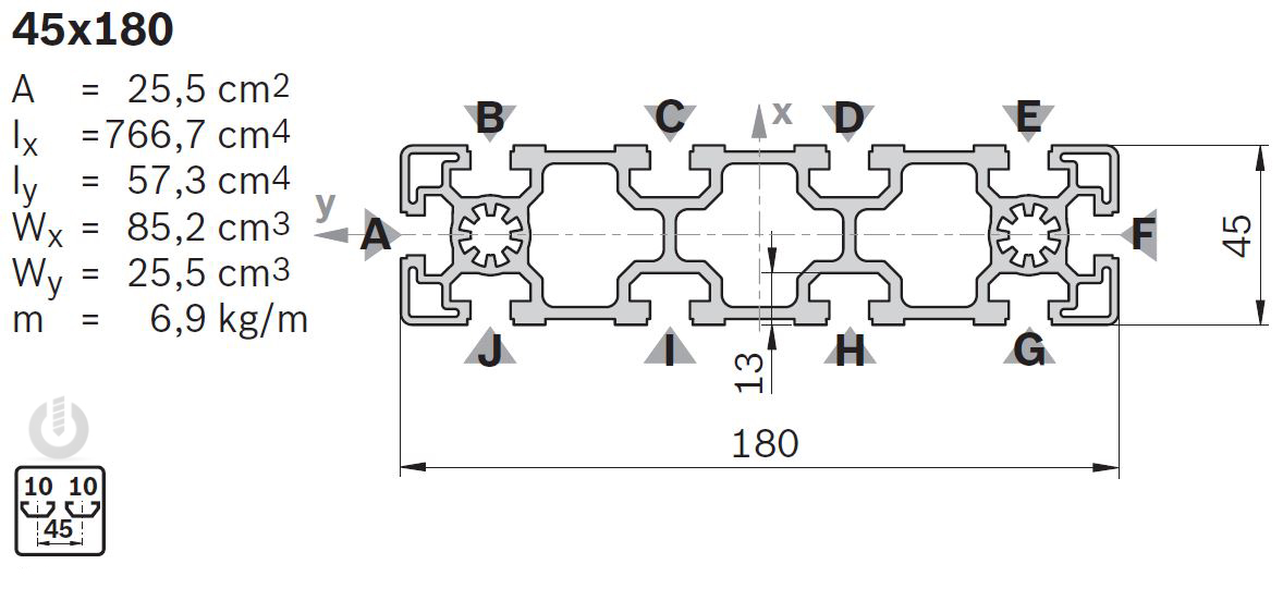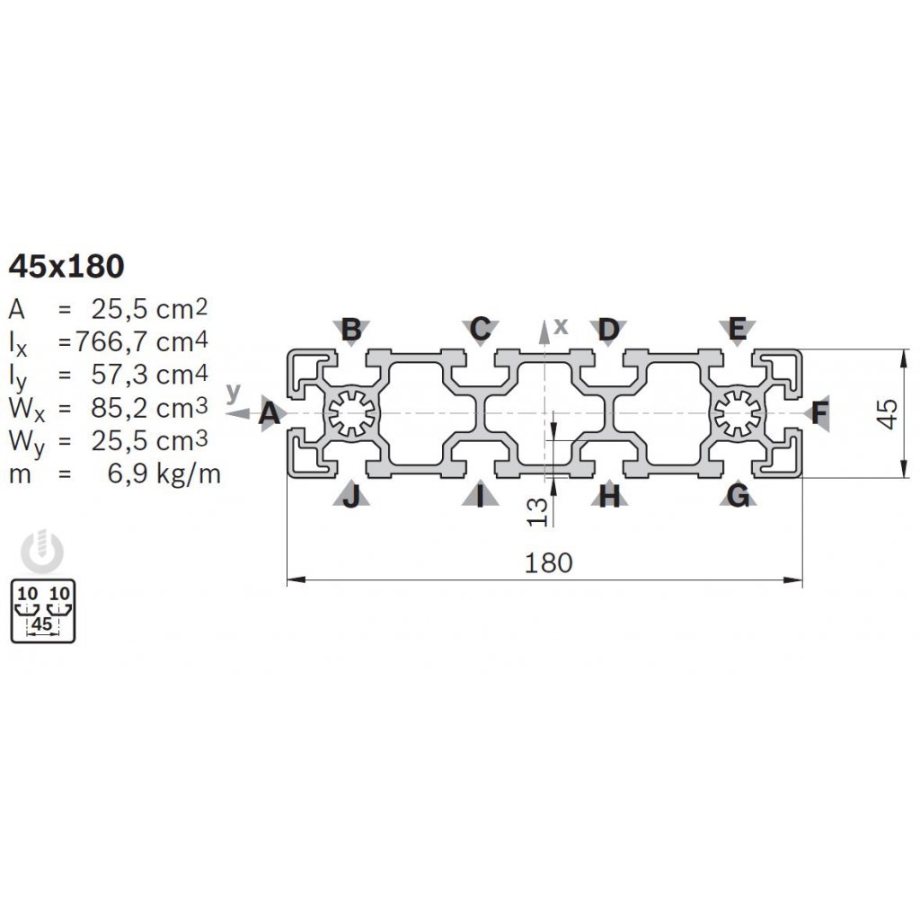 | Description | Aluminium Heavy Strut Profile | 10mm groove | 45 x 180mm | Genuine Bosch Rexroth |