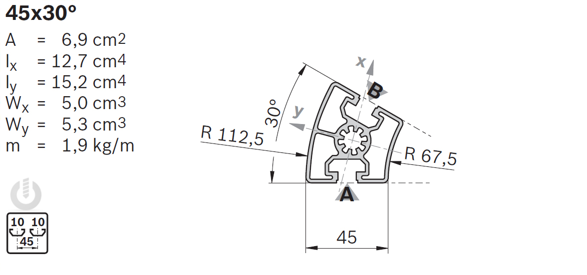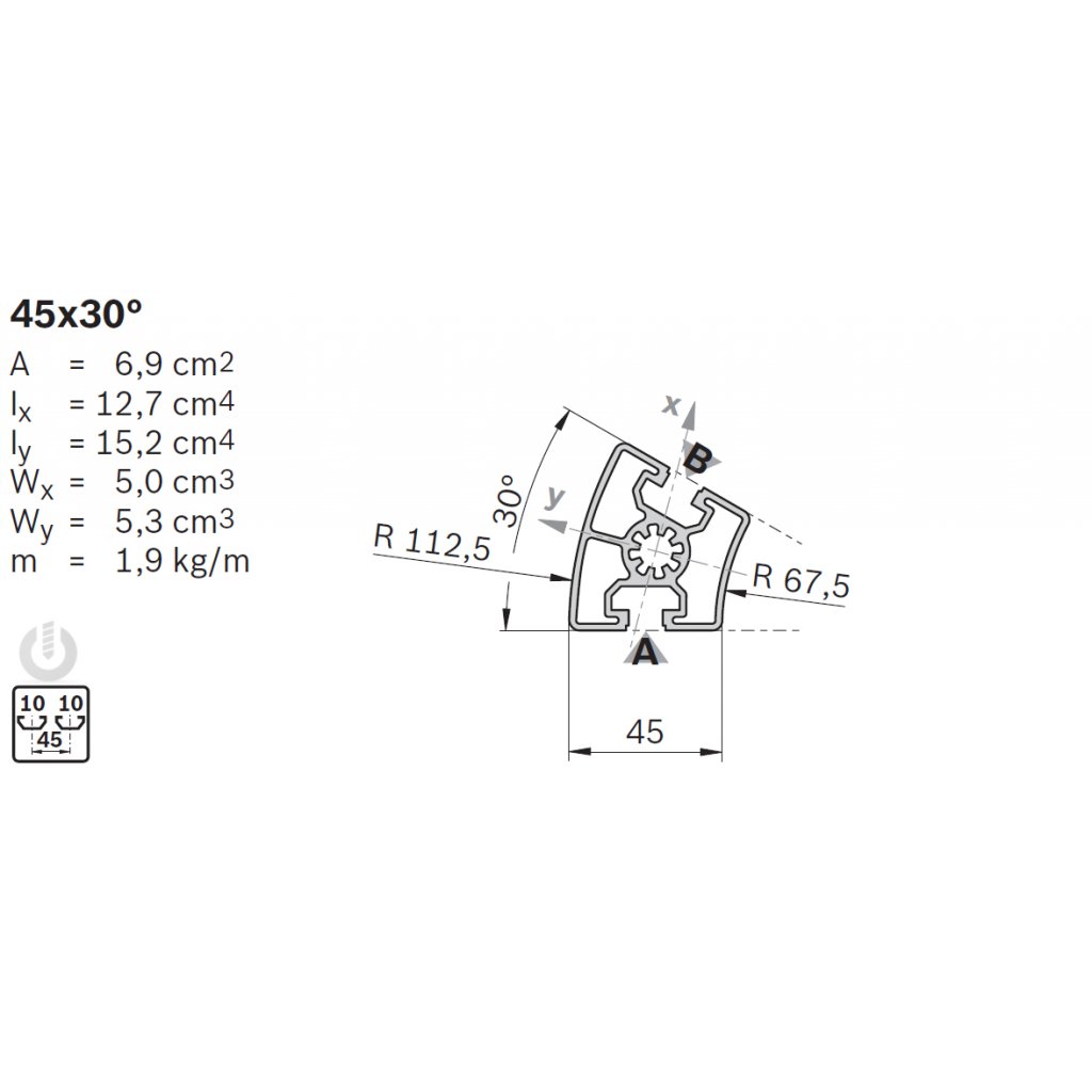 | Description | Aluminium Strut Profile | 10mm groove | 45 x 30° | Genuine Bosch Rexroth |