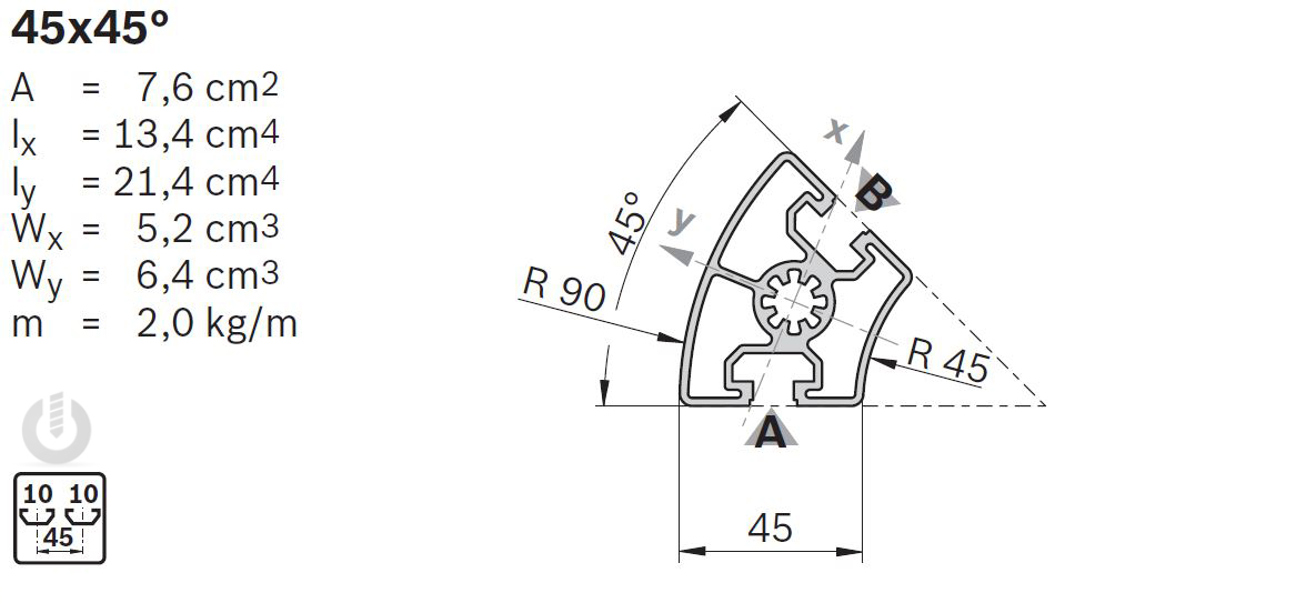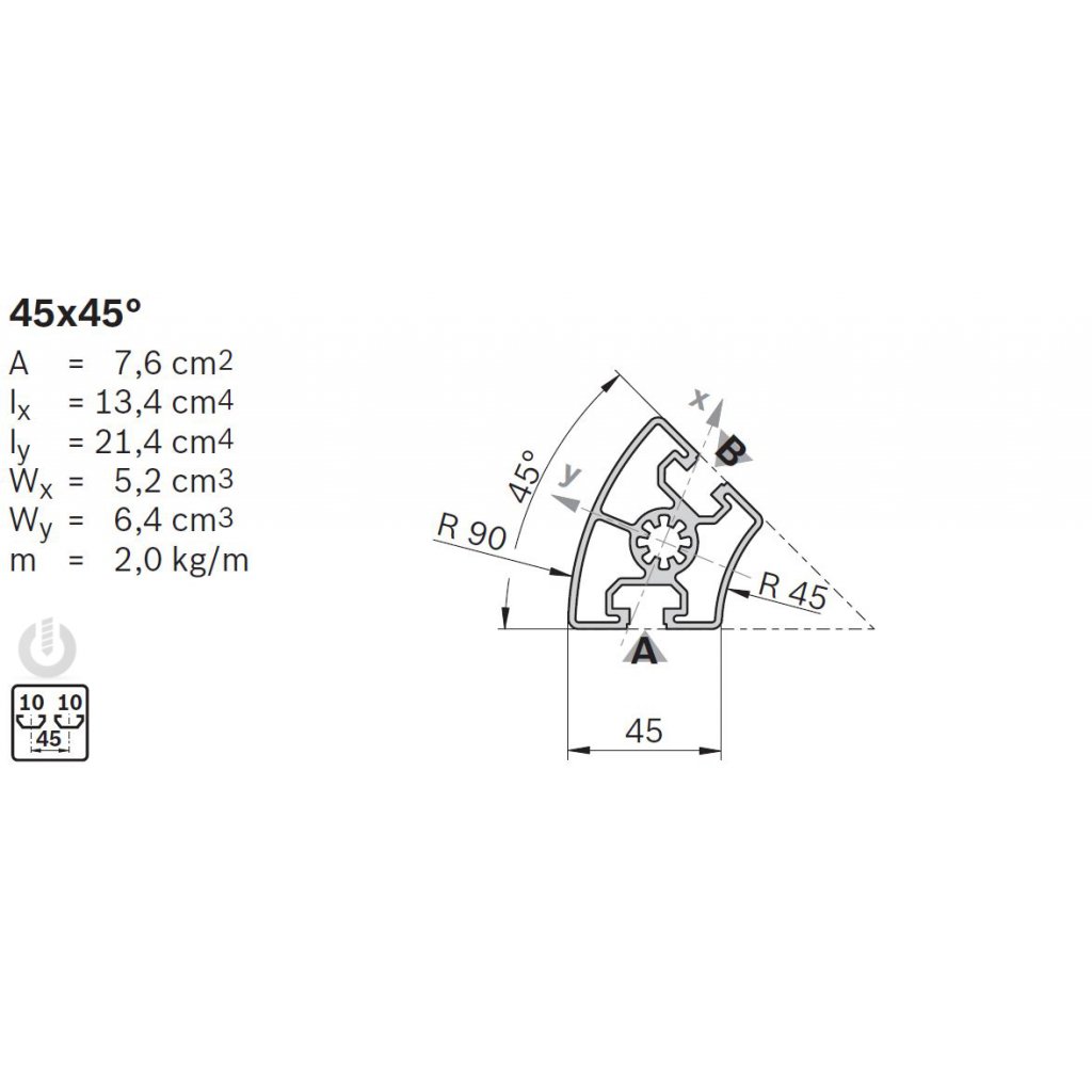 | Description | Aluminium Strut Profile | 10mm groove | 45 x 45° | Genuine Bosch Rexroth |