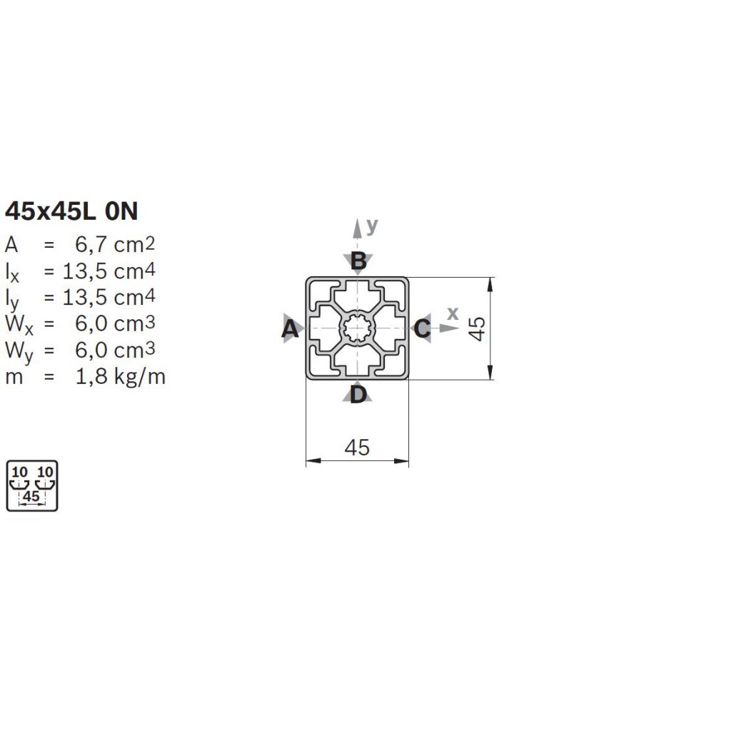 | Description | Aluminium Light Strut Profile | 10mm groove | 45 x 45mm | 0N | Genuine Bosch Rexroth |