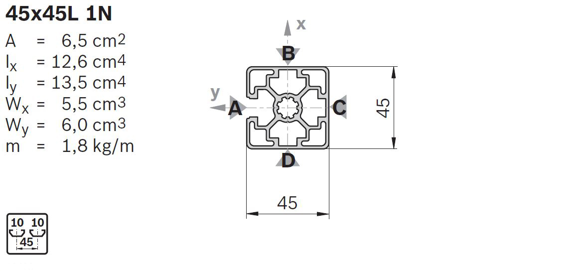 | Description | Aluminium Light Strut Profile | 10mm groove | 45 x 45mm | 1N | Genuine Bosch Rexroth |