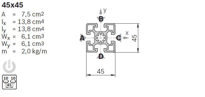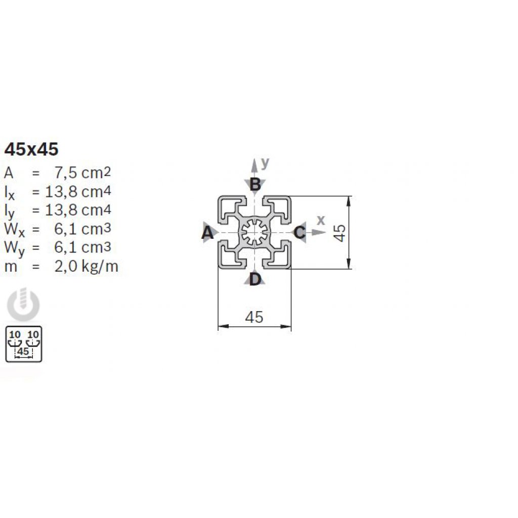 | Description | Aluminium Heavy Strut Profile | 10mm groove | 45 x 45mm | Genuine Bosch Rexroth |