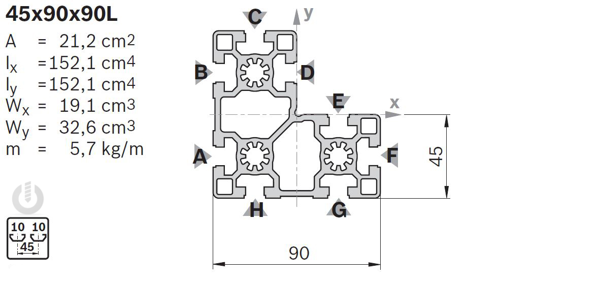 | Description | Aluminium Light Strut Profile | 10mm groove | 45 x 90 x 90mm | Genuine Bosch Rexroth |