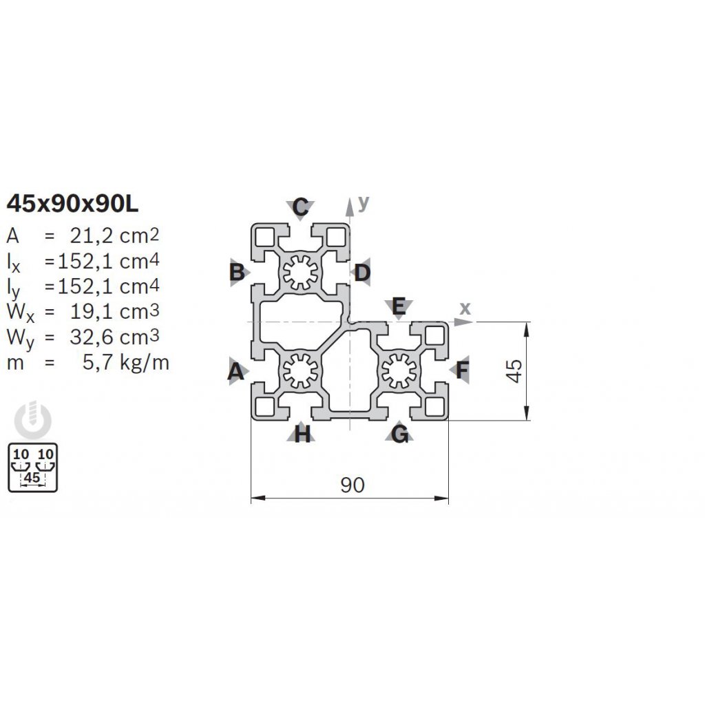 | Description | Aluminium Light Strut Profile | 10mm groove | 45 x 90 x 90mm | Genuine Bosch Rexroth |