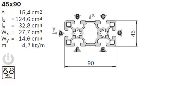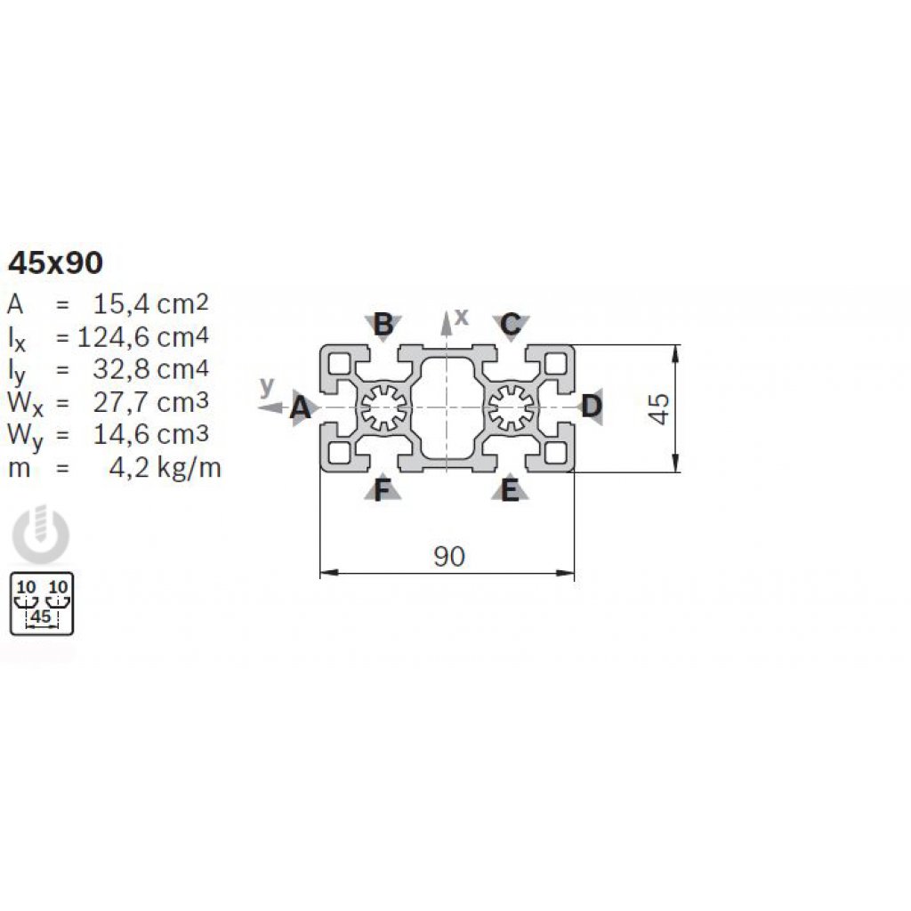 | Description | Aluminium Heavy Strut Profile | 10mm groove | 45 x 90mm | Genuine Bosch Rexroth |