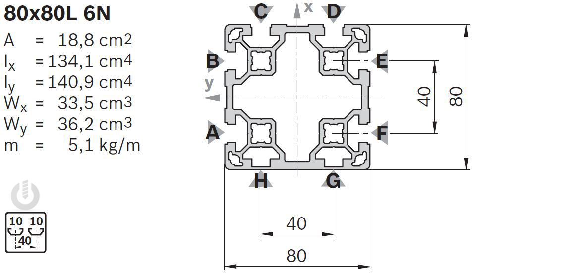 | Description | Aluminium Light Strut Profile | 10mm groove | 80 x 80mm | 6N | Genuine Bosch Rexroth |