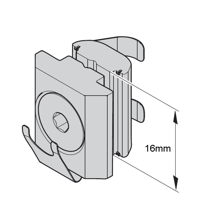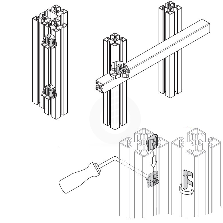 For a gap free connection between two strut profiles paralel to the axis or at any angle. Parallel connector consisting of two sliding blocks with welded springs for simple assembly. Attractive interior connection, e.g for material shelves. Connection possible in any position.