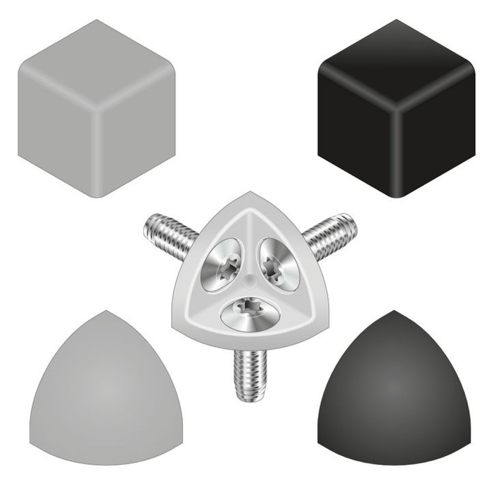 Corner bracket for corner connection of three square or half round profiles with equivalent cross sections.