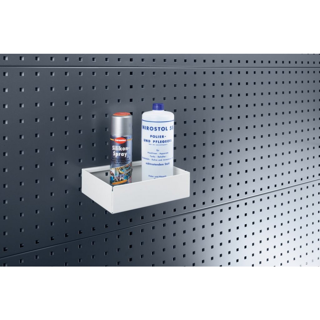 Durable epoxy powder coat finish in RAL 7035 light grey, fits to perfo panel with quick fix perfolock enabling easy repositioning.