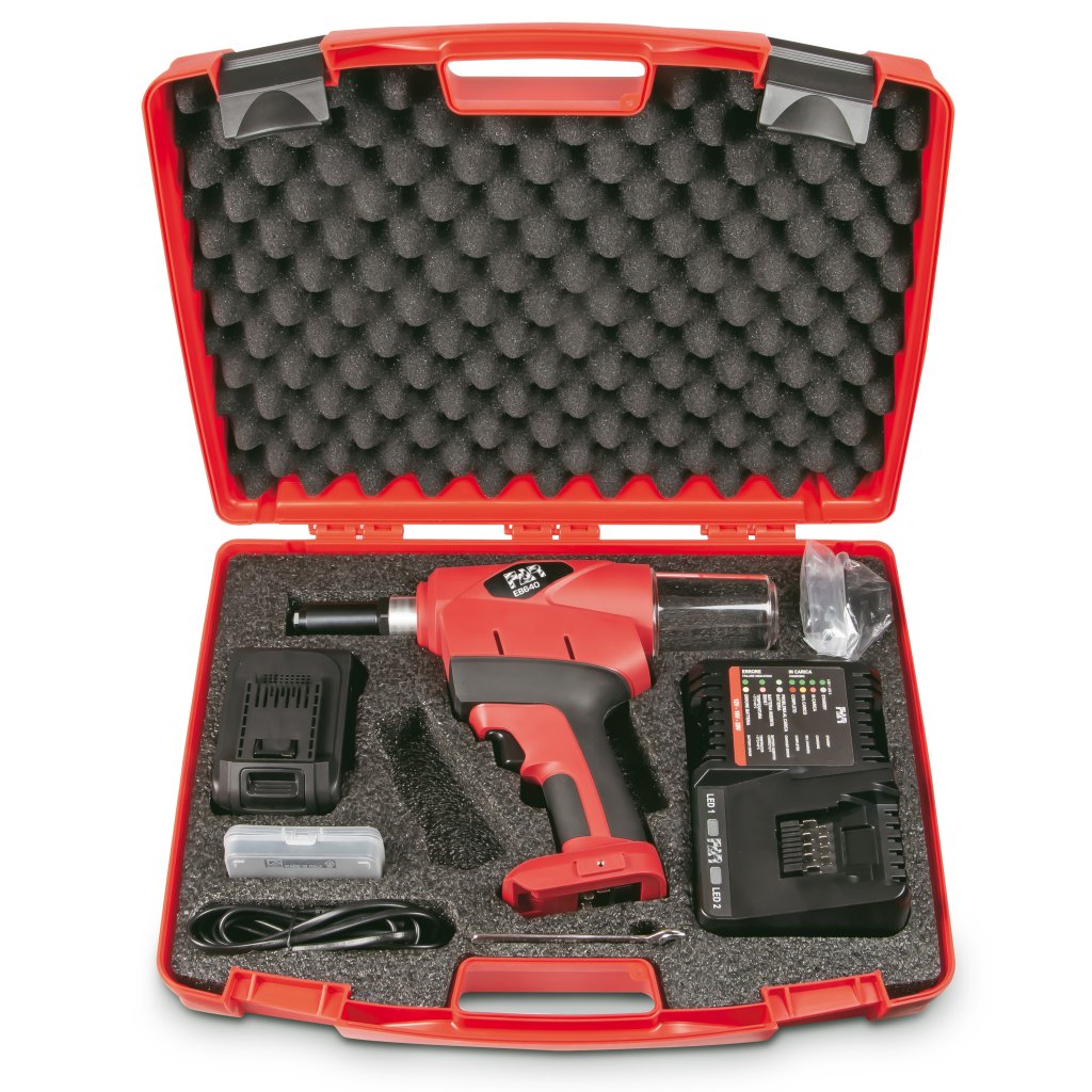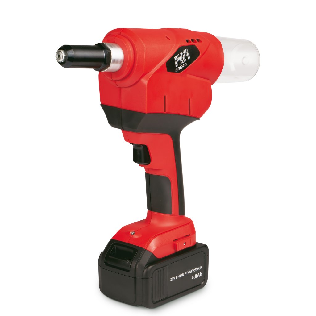 The FAR EB640 Extra Riveter is a cordless battery tool perfect for use with blind rivets from 4.8mm up to 6.4mm in aluminium ,steel and stainless steel, and 7.8mm in aluminium. It will also set 4.8 - 6.4mm in Tamp, 4.8 and 6.4mm in FarBolt / Monobolt, and finally 4.8mm in Mulinox and Multifar applications. The EB640 Extra also sets 5.2mm in X/S Trifar rivers. All standard rivet nosepieces sold complete with tool.