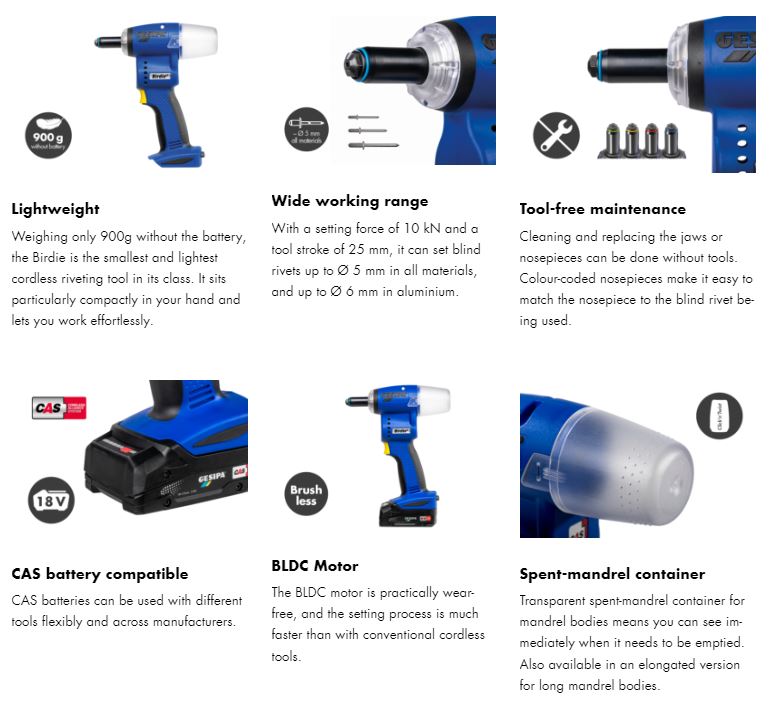 Not only are the Birdie's size and weight impressively low, but it has also been equipped with the latest and most innovative technology. So this blind riveting tool offers flexibility when working together with some unique benefits.
