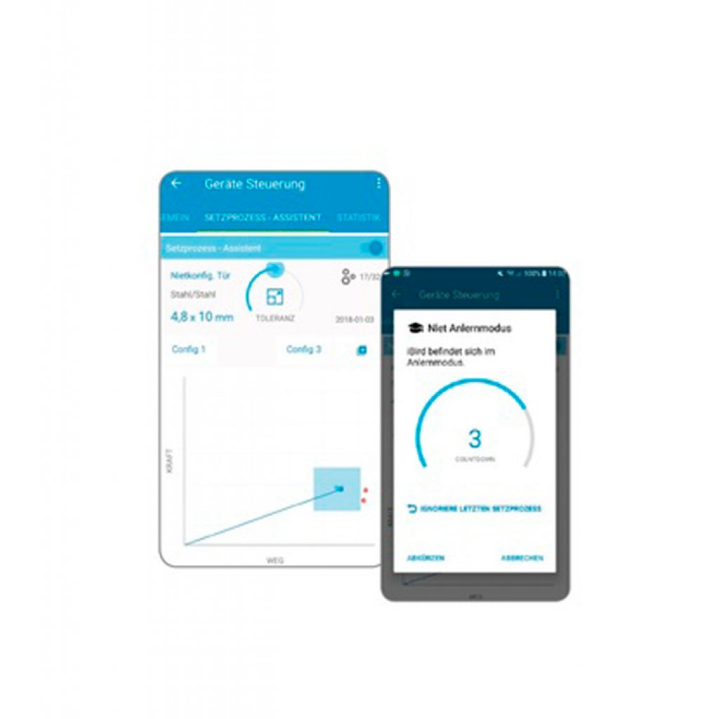 The setting process assistant premium software is a optional extra to the iBird Pro Tool. The software helps operators to adjust the setting process and evaluate riveting processes. If a fault detected, a message is issued in the app and the Andon ring lights up in colour. The teaching mode is a simple learning of rivet configurations and setting of the tolerance window by means of the virtual control dial.
