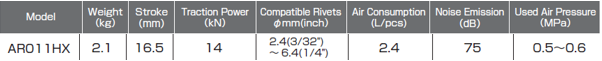 The Lobster AR-011HX rivet tool is a lightweight pneumatic tool. This tool is a more heavy duty and robust model which is capable of setting larger rivets. This tool also offers excellent value for money with a lower noise level