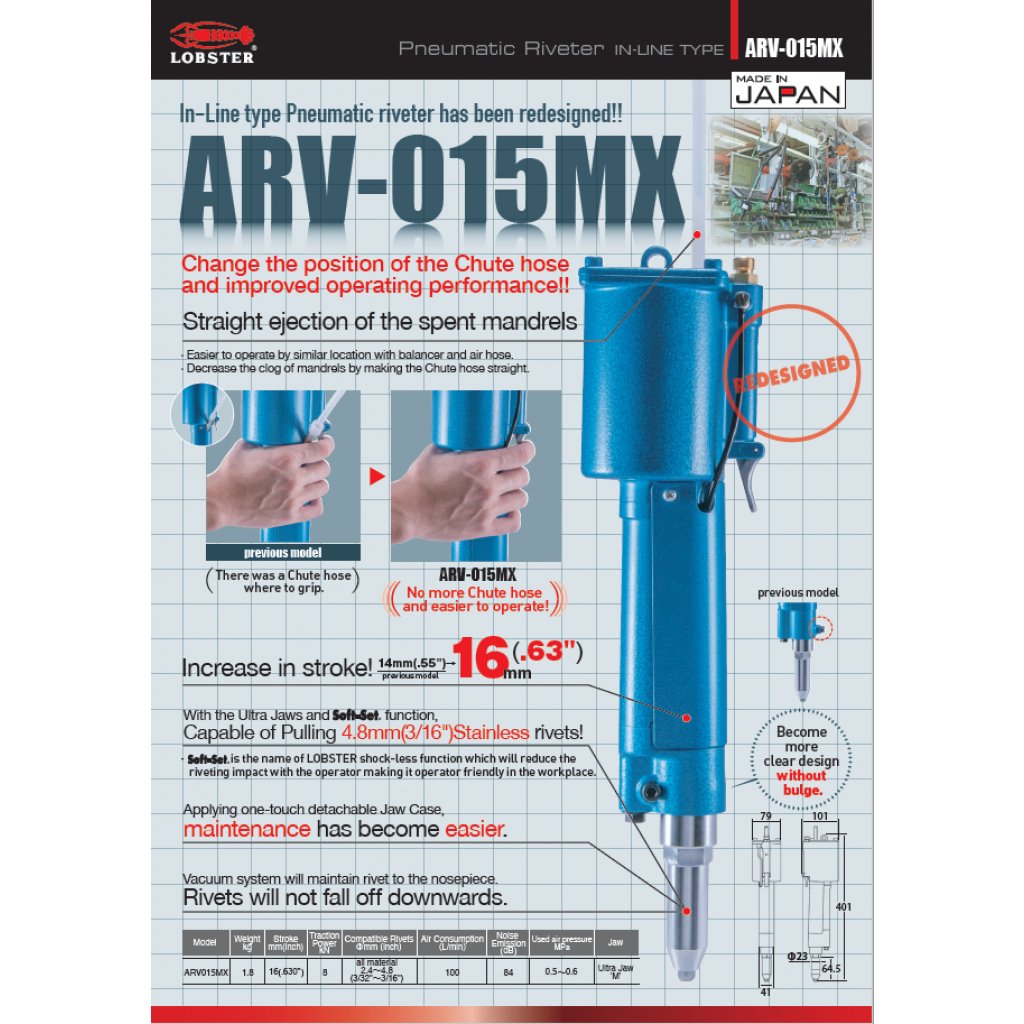 The Lobster ARV-015MX rivet tool is a redesigned/improved lightweight In-line type & Vacuum System tool which sets 2.4mm to 4.8mm rivets in Steel, Stainless Steel and Aluminium Rivets. The tools lightweight In-line type Vacuum System design is ideal to maintain the rivet to the nosepiece. Rivets will not fall off downwards.