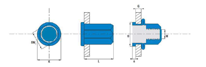 | Diameter (M) | L (mm) | K (mm) | E(mm) | D (mm) | SW1 (mm) | Grip Range (mm) | Max Torque (Nm) | Pull out (N) | Shear (N) |